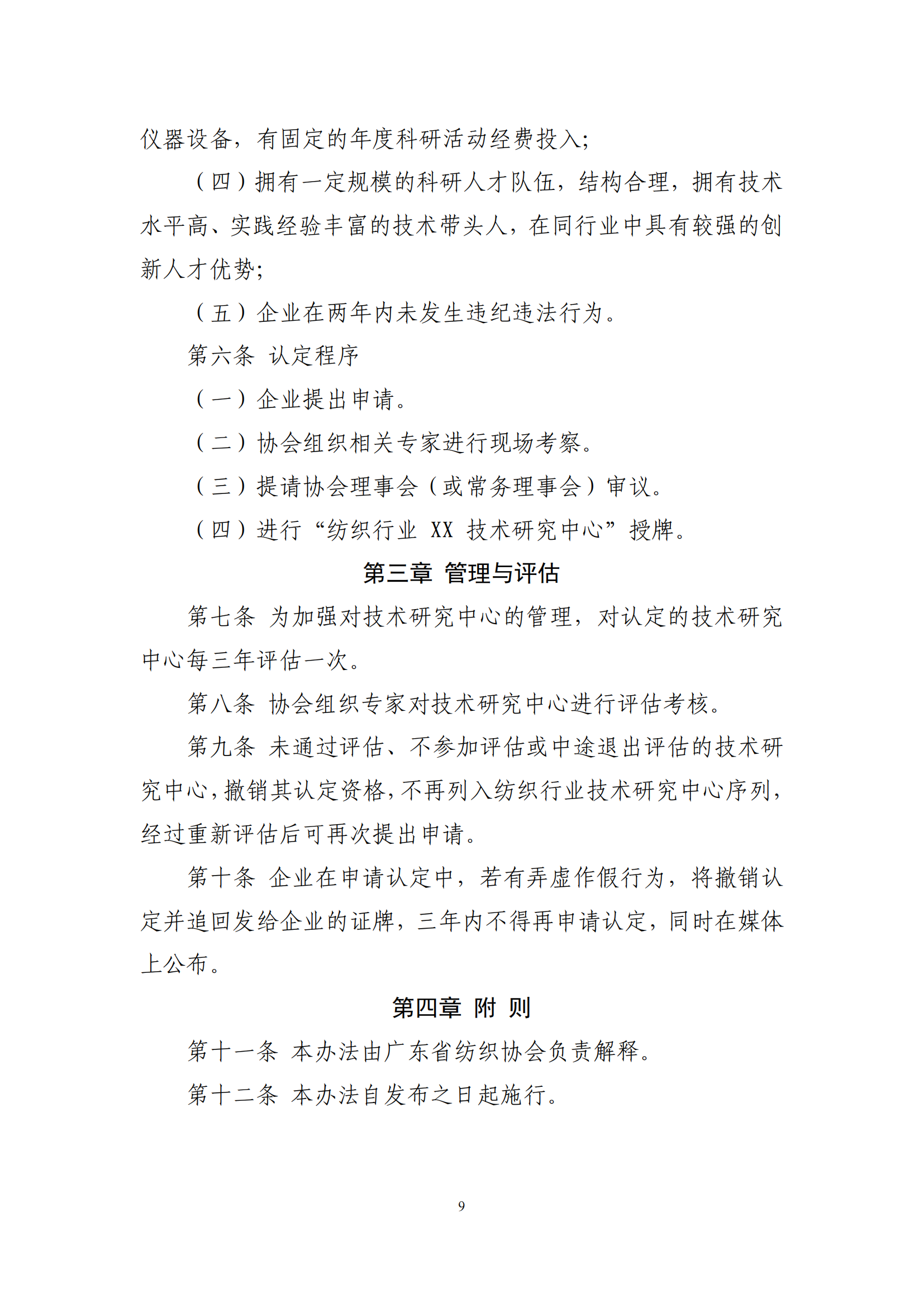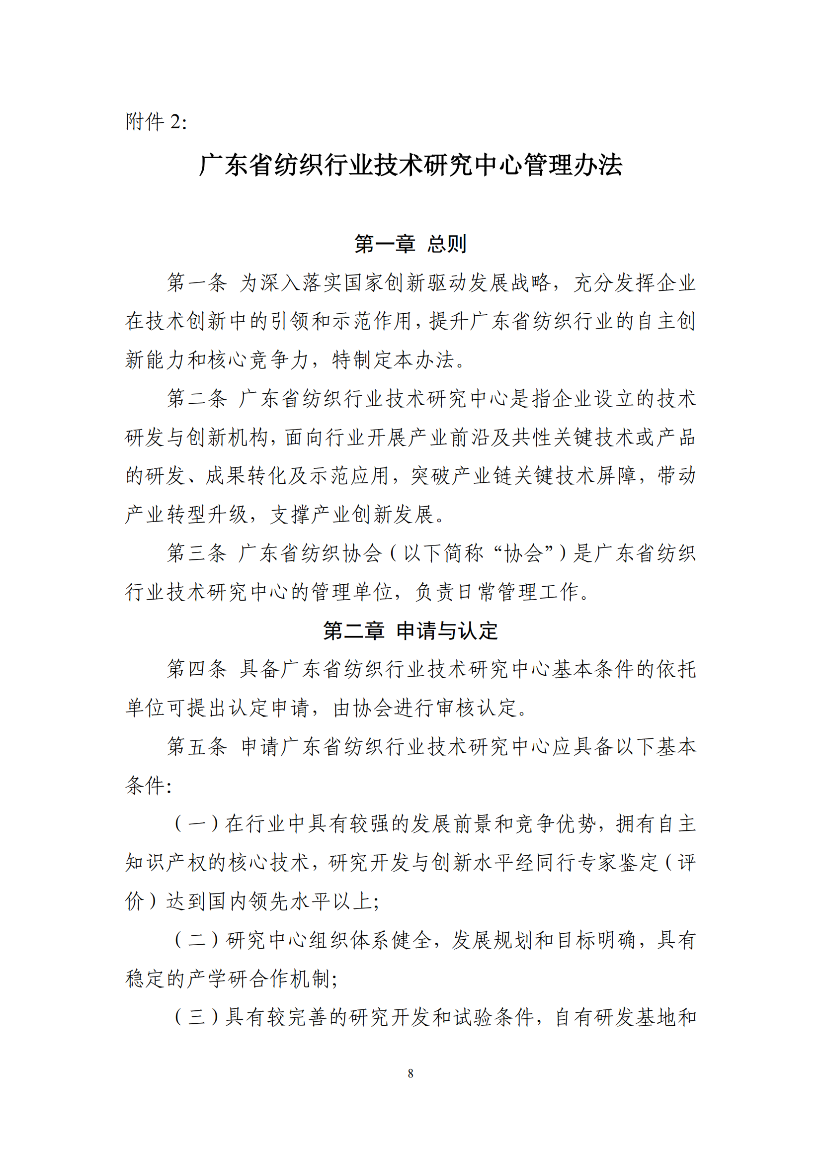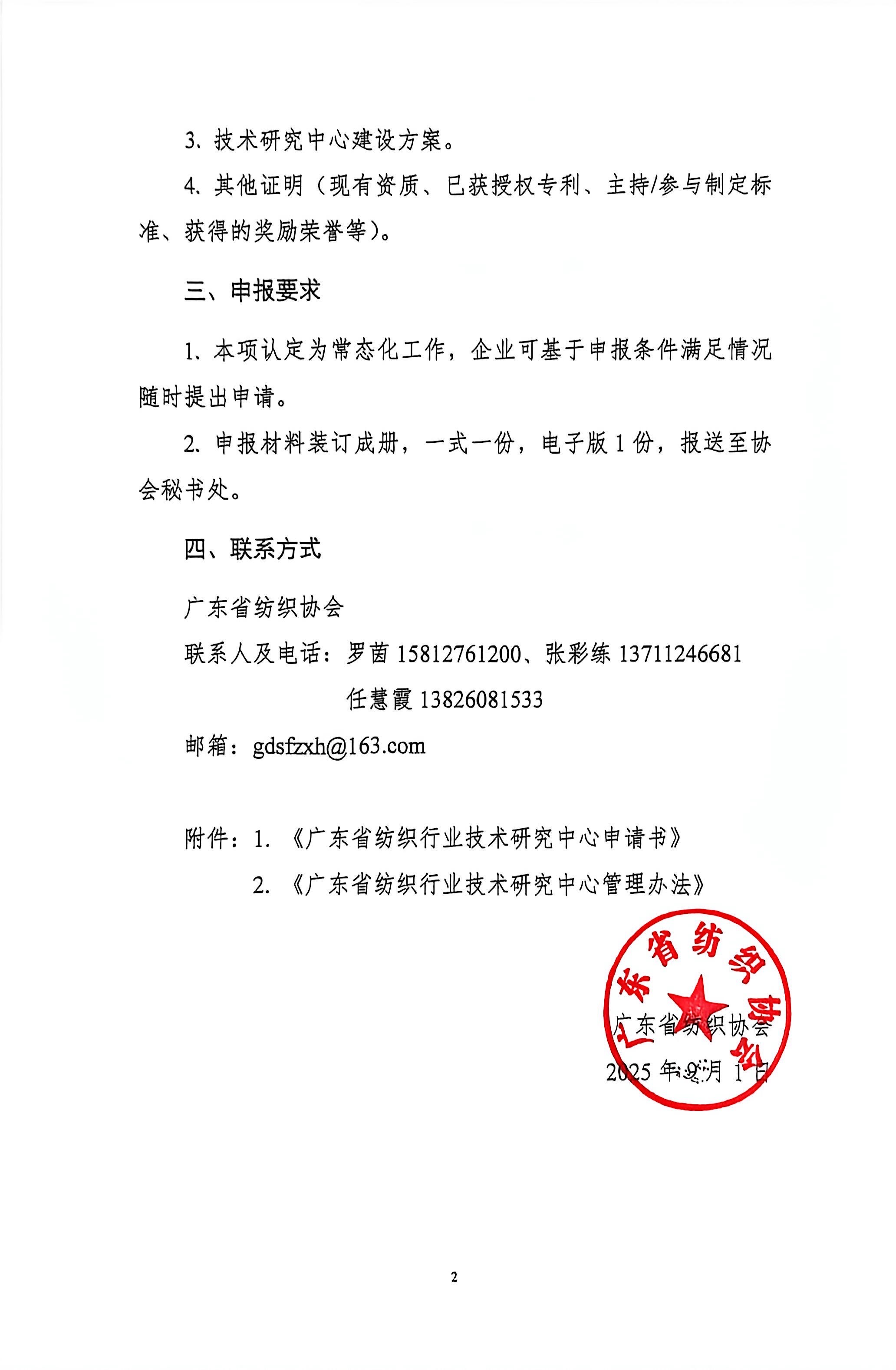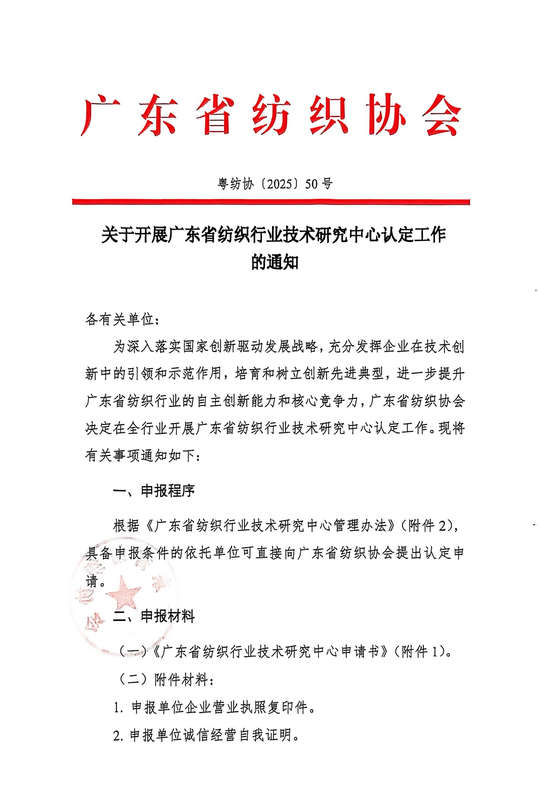 关于开展广东省纺织行业技术研究中心认定工作的通知发表时间:2025-09-04 11:35 各有关单位: 为深入落实国家创新驱动发展战略,充分发挥企业在技术创新中的引领和示范作用,培育和树立创新先进典型,进一步提升广东省纺织行业的自主创新能力和核心竞争力,广东省纺织协会决定在全行业开展广东省纺织行业技术研究中心认定工作。现将有关事项通知如下: 一、申报程序 根据《广东省纺织行业技术研究中心管理办法》(附件2),具备申报条件的依托单位可直接向广东省纺织协会提出认定申请。 二、申报材料 (一)《广东省纺织行业技术研究中心申请书》(附件1)。 (二)附件材料: 1. 申报单位企业营业执照复印件。 2. 申报单位诚信经营自我证明。 3. 技术研究中心建设方案。 4. 其他证明(现有资质、已获授权专利、主持/参与制定标准、获得的奖励荣誉等)。 三、申报要求 1. 本项认定为常态化工作,企业可基于申报条件满足情况随时提出申请。 2. 申报材料装订成册,一式一份,电子版1份,报送至协会秘书处。 广东省纺织协会 联系人及电话:罗茵15812761200、张彩练13711246681、任慧霞13826081533 邮箱:gdsfzxh@163.com ![]() ![]() ![]() ![]() ![]() ![]() ![]() ![]() ![]()